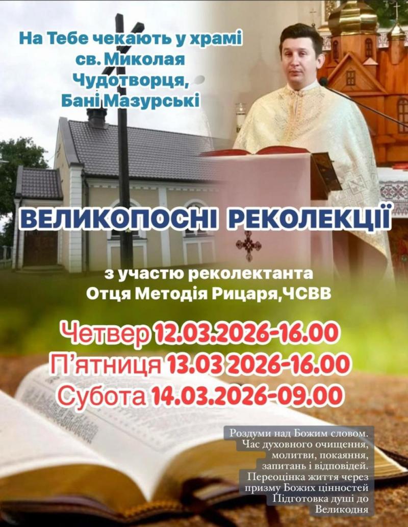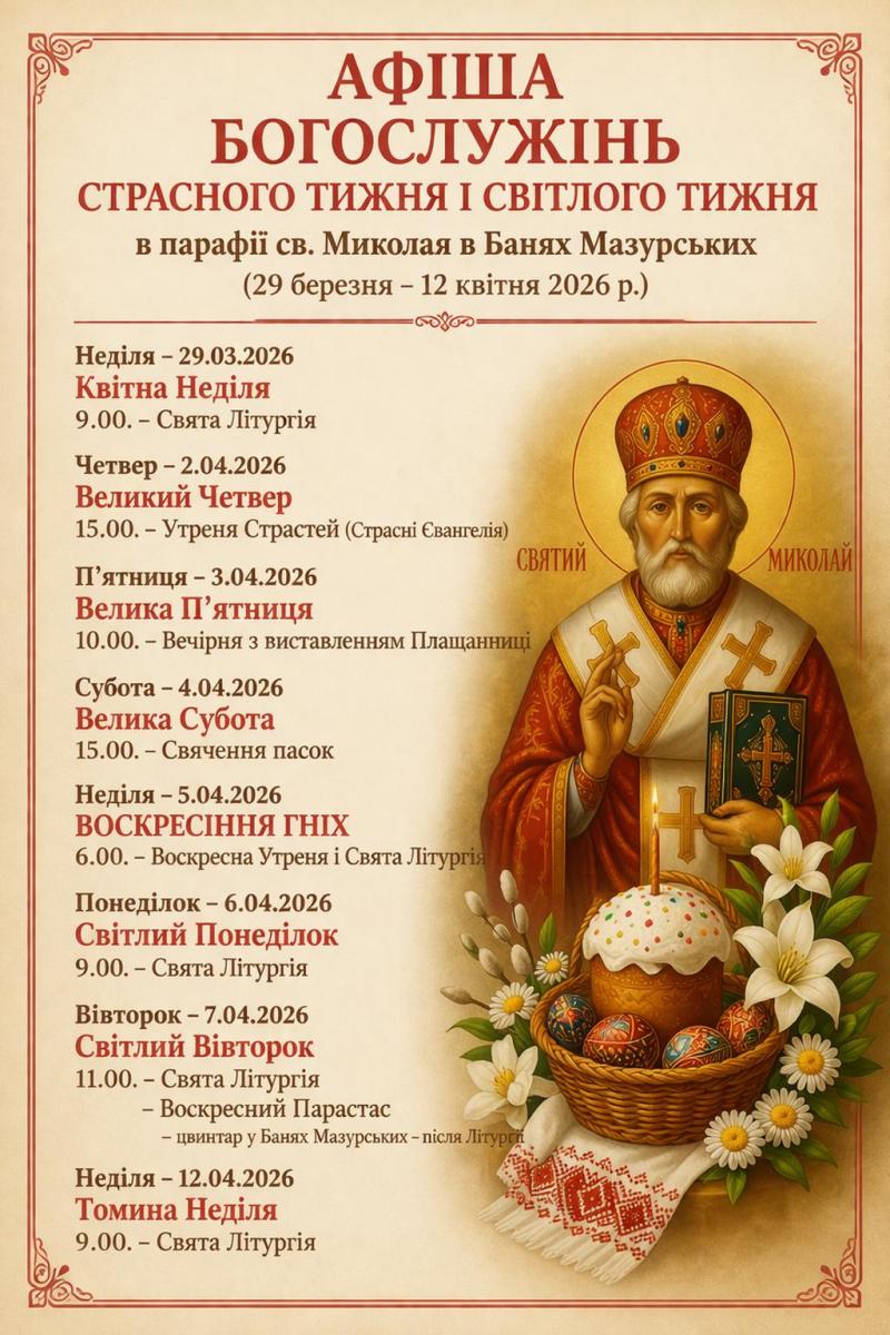 27 грудня 2025 року у храмі святого Миколая в Банях Мазурських після Святої Літургії відбувся виступ з колядою місцевого хору та молодих місцевих і приїжджих зі Львова артистів. Дуже дякуємо за гарну різдвяну атмосферу! ...